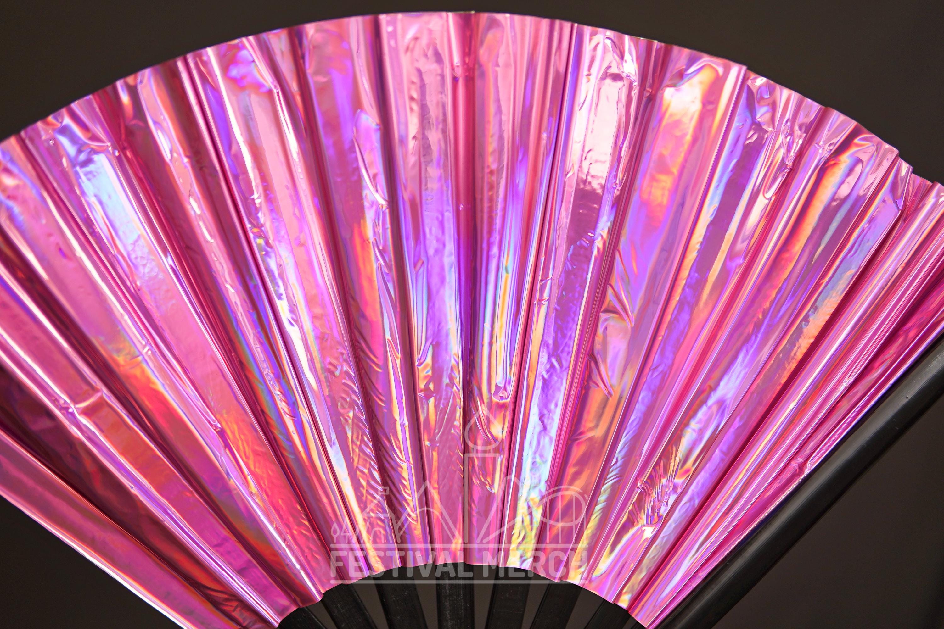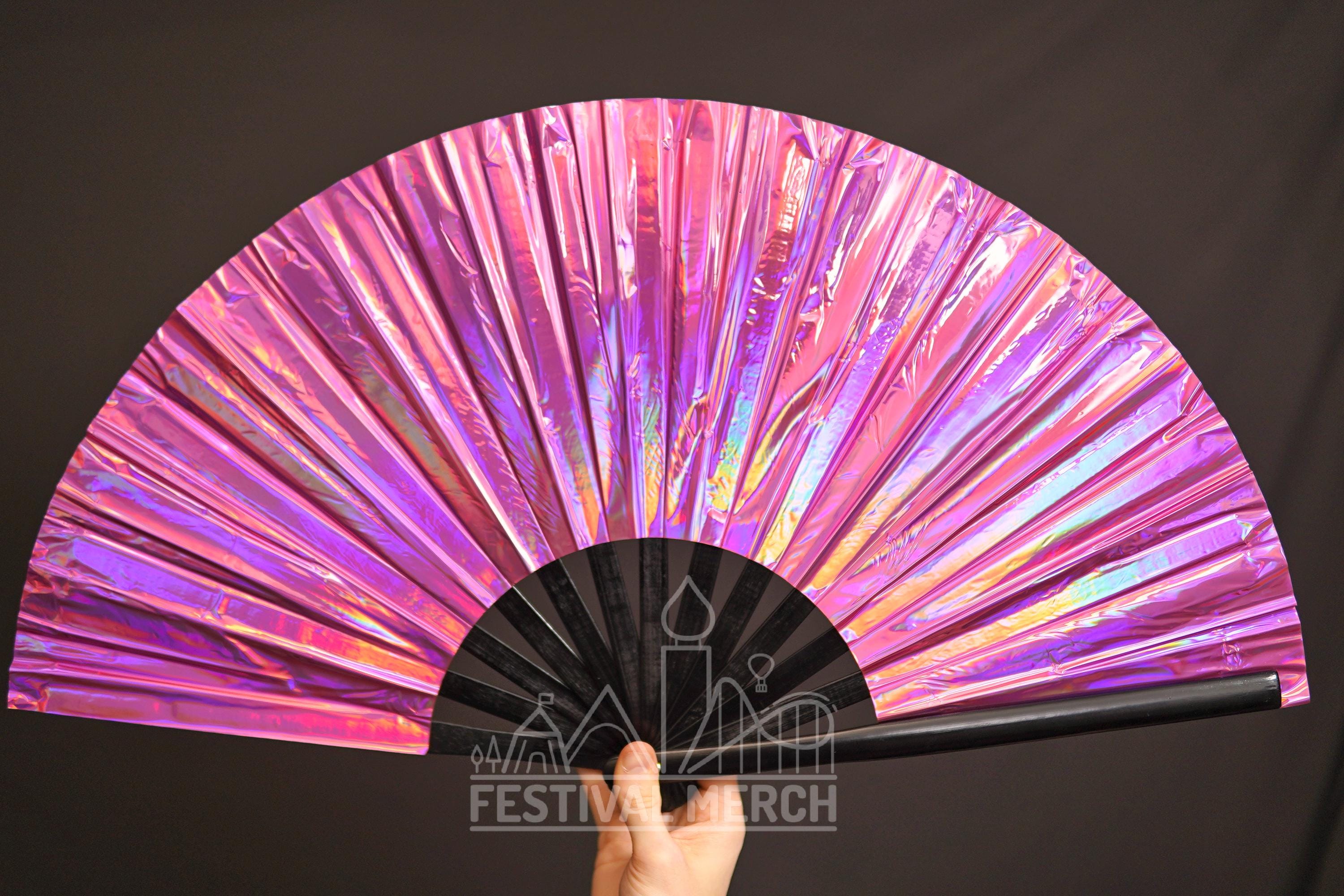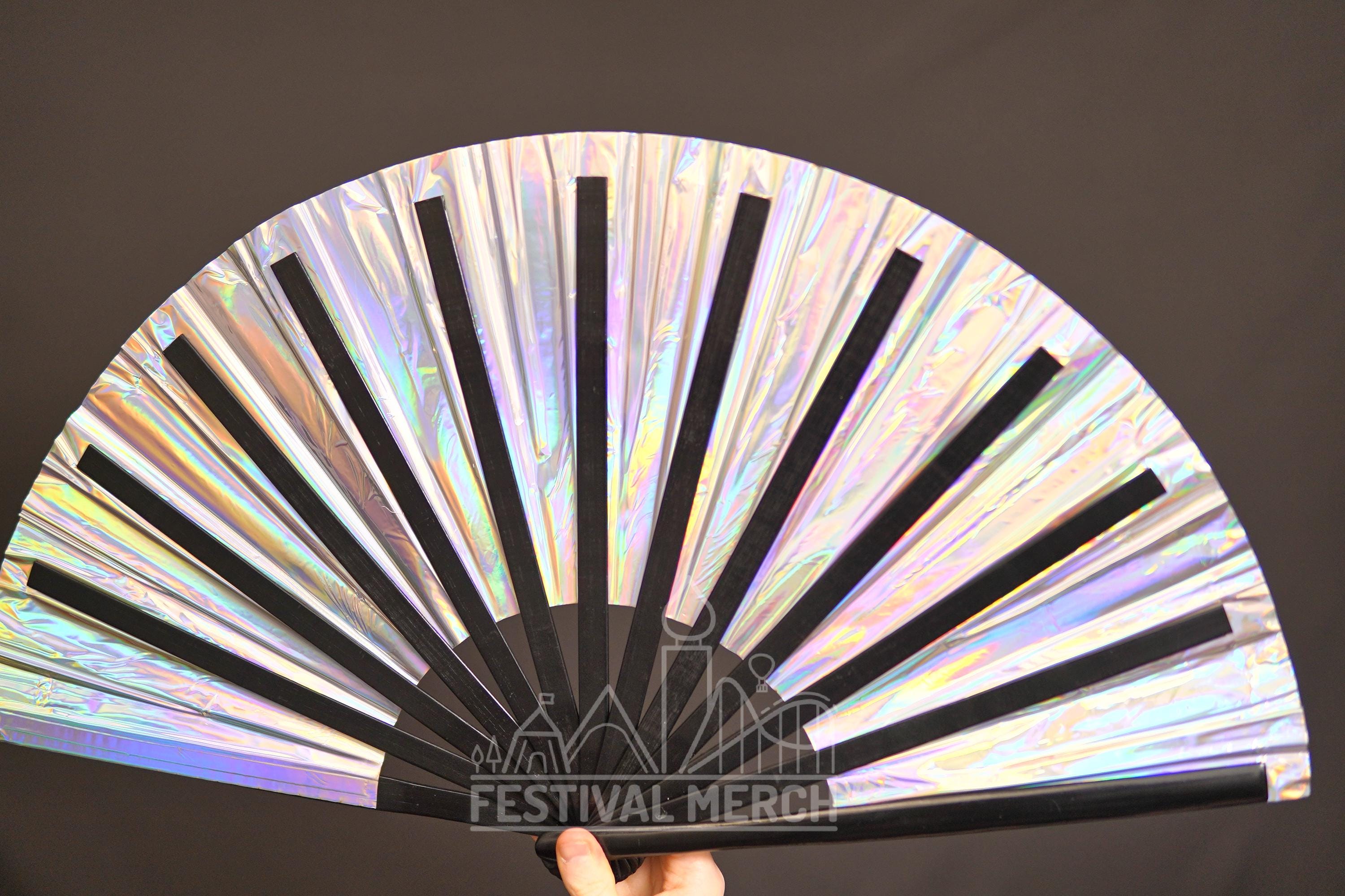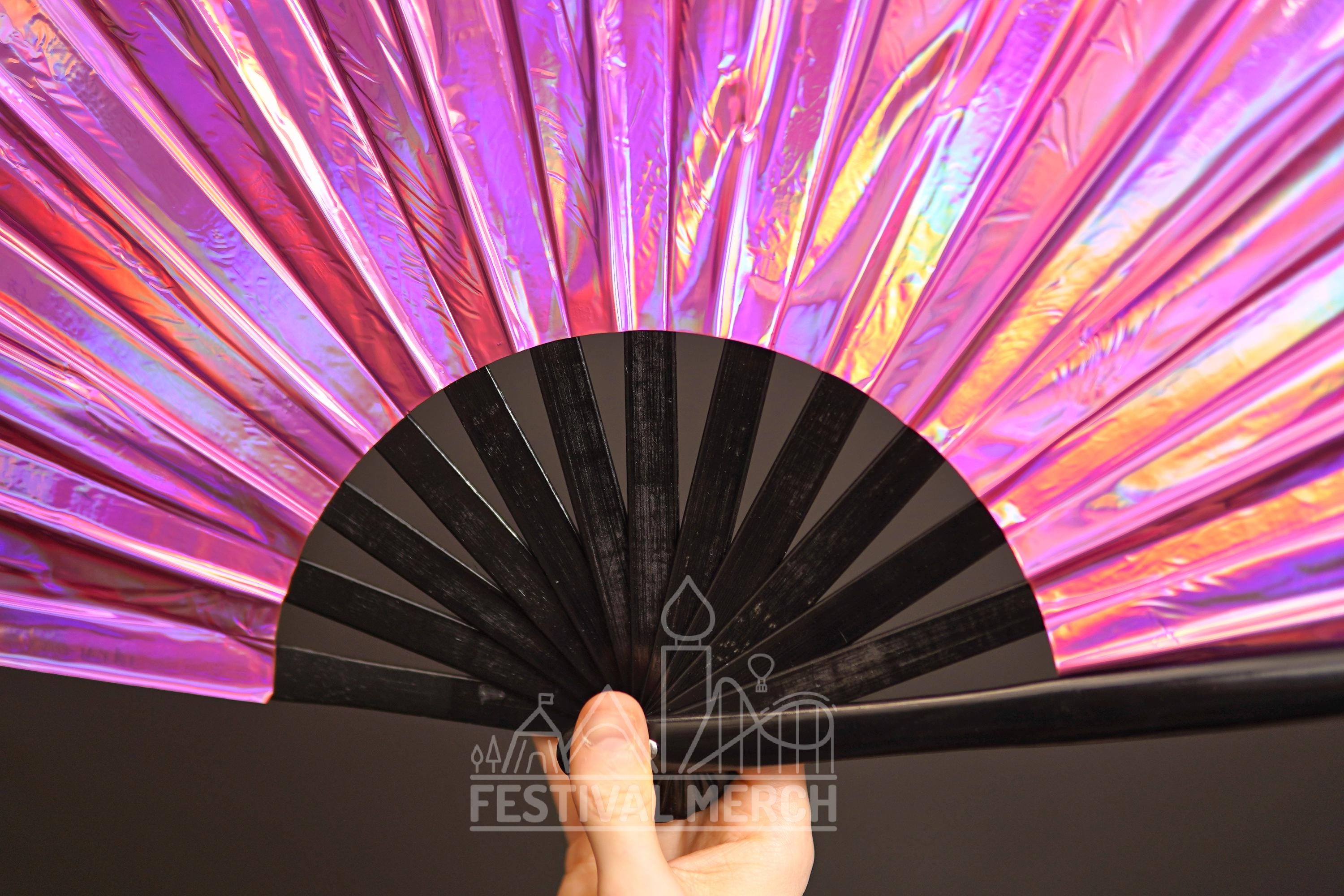 Iridescent Hand Fan XL Bamboo | Festival Merch | Vinyl Shimmer Clack Fan | EDM Rave accessories | Pride Festival | Holographic Ibiza Holiday