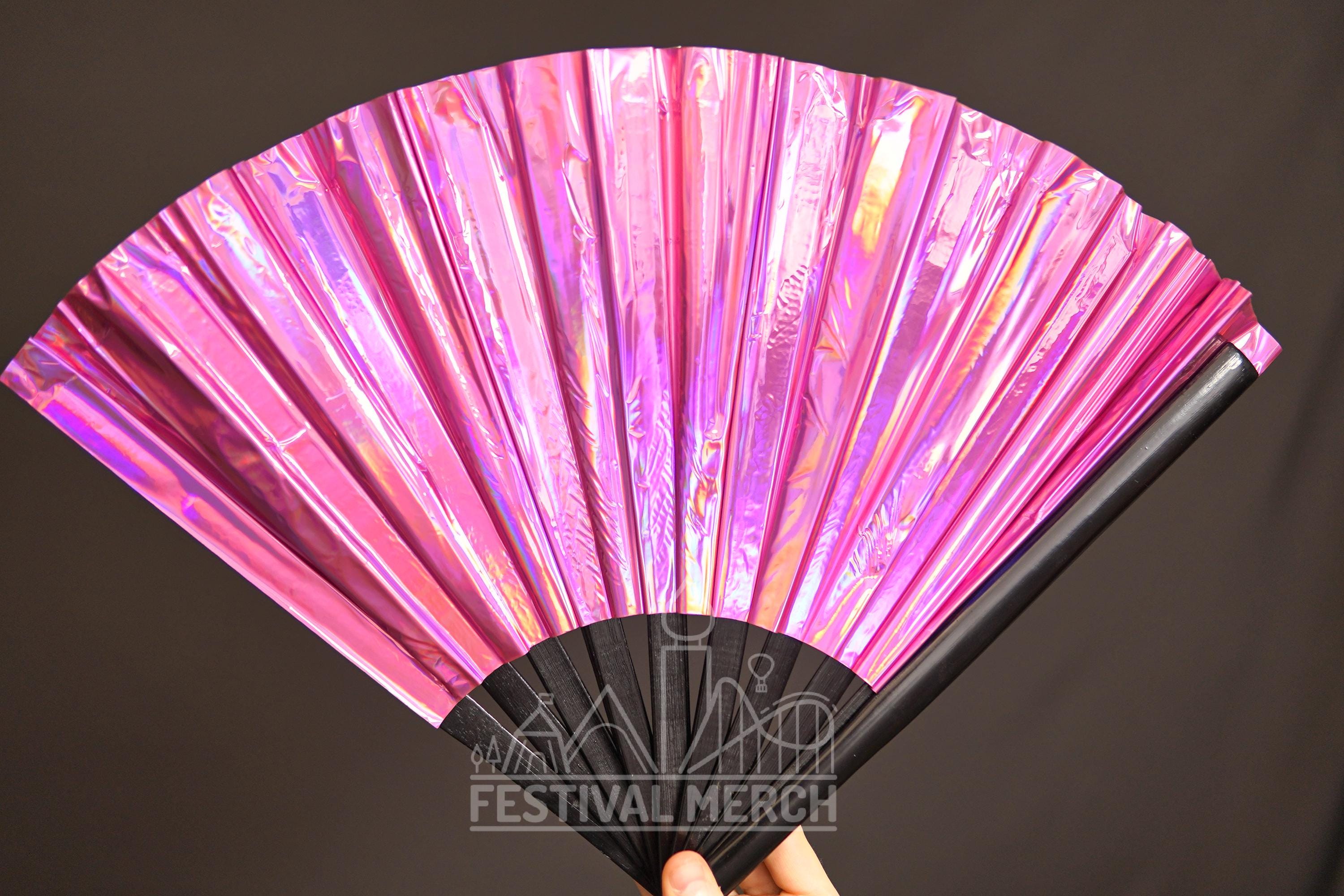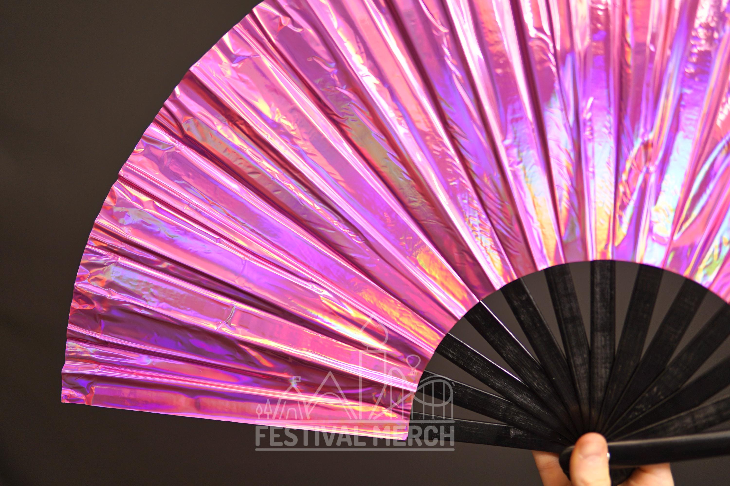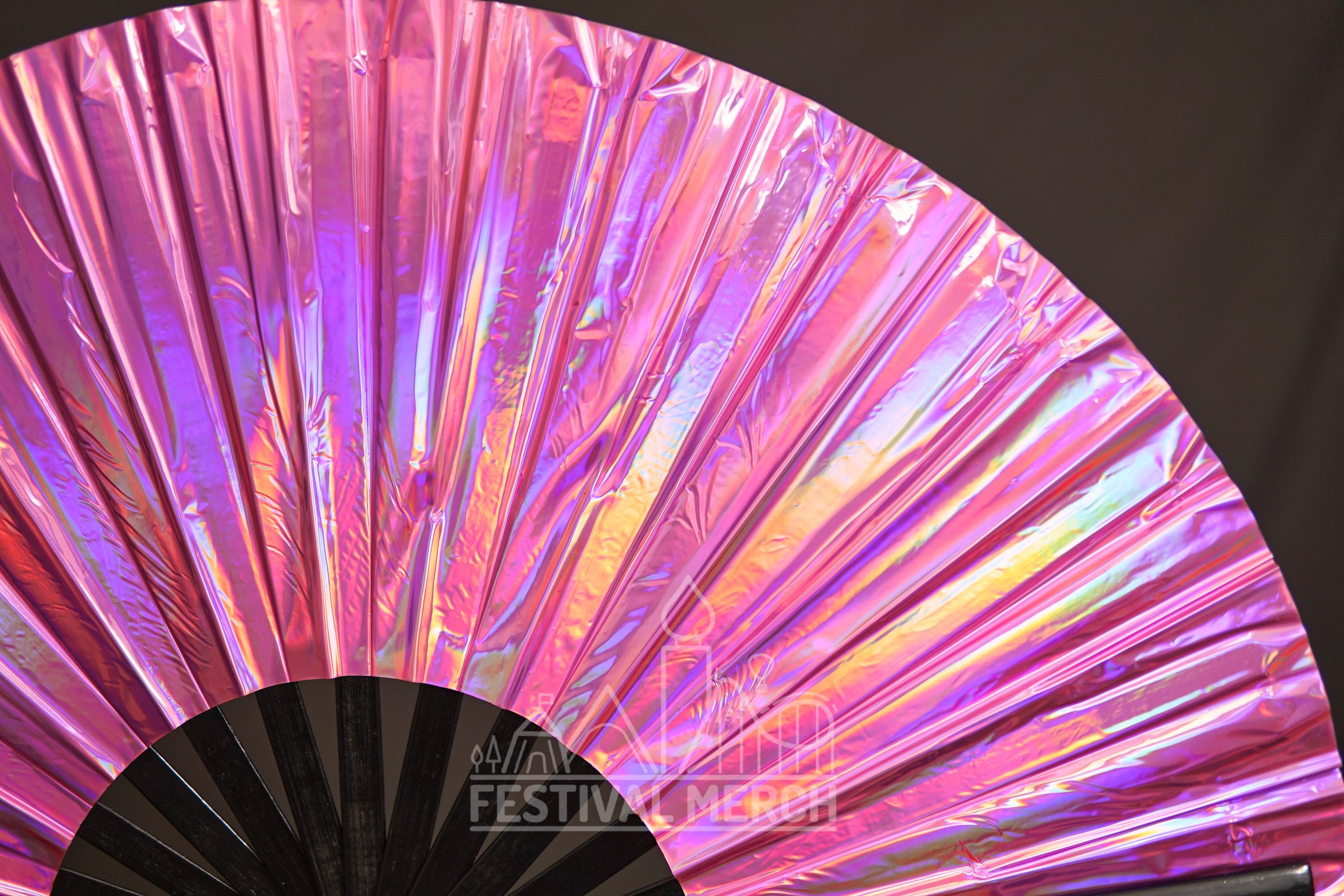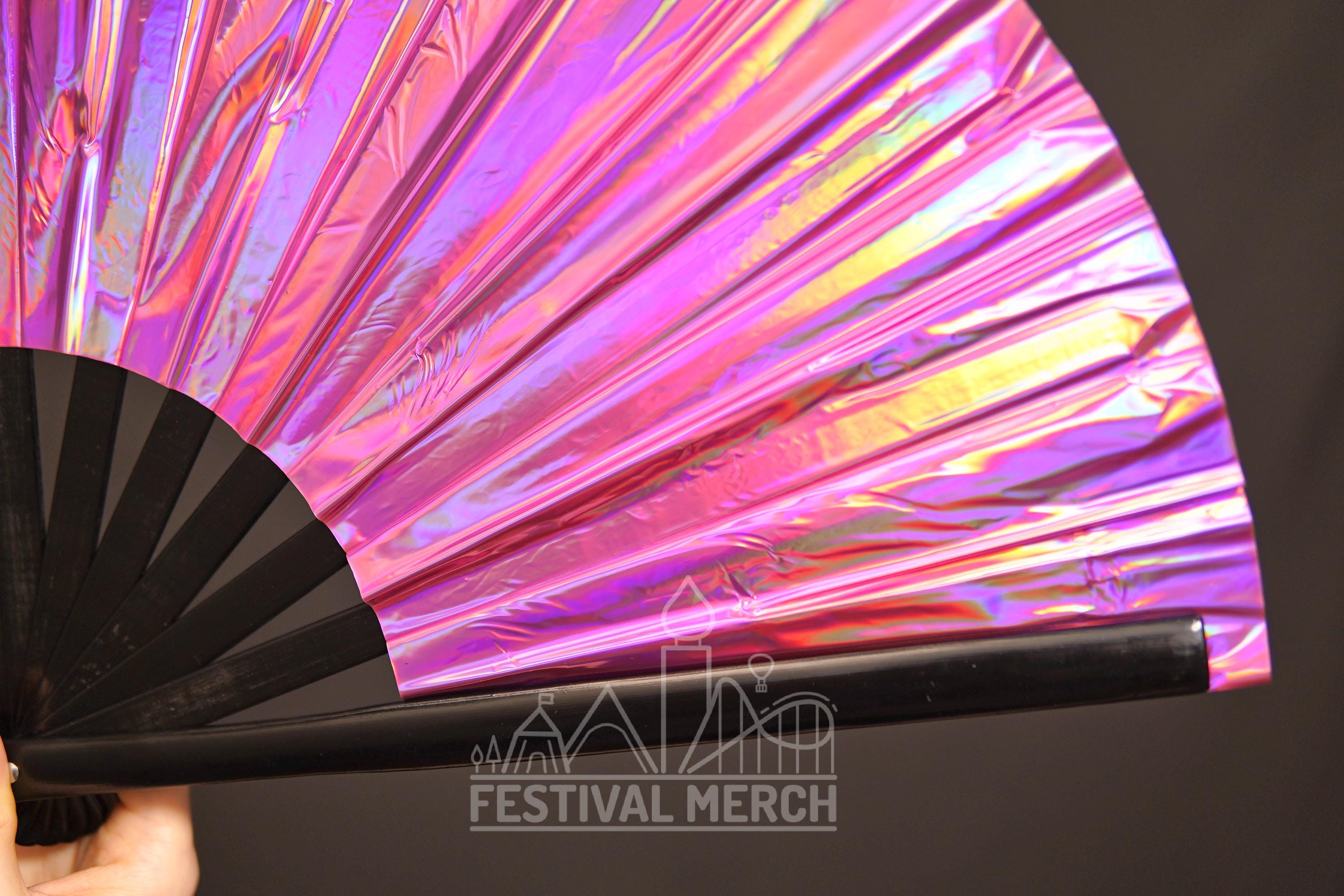Iridescent Hand Fan XL Bamboo | Festival Merch | Vinyl Shimmer Clack Fan | EDM Rave accessories | Pride Festival | Holographic Ibiza Holiday